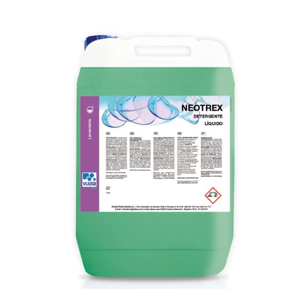 Neotrex es un detergente líquido completo y versátil, formulado con espuma controlada y alto contenido en jabones, ideal para el lavado de todo tipo de ropa, colores y tejidos. Su eficacia está garantizada incluso en lavados a baja temperatura o ciclos de corta duración, lo que lo convierte en una solución perfecta para lavanderías, hoteles, residencias y colectividades con gran rotación de ropa.
